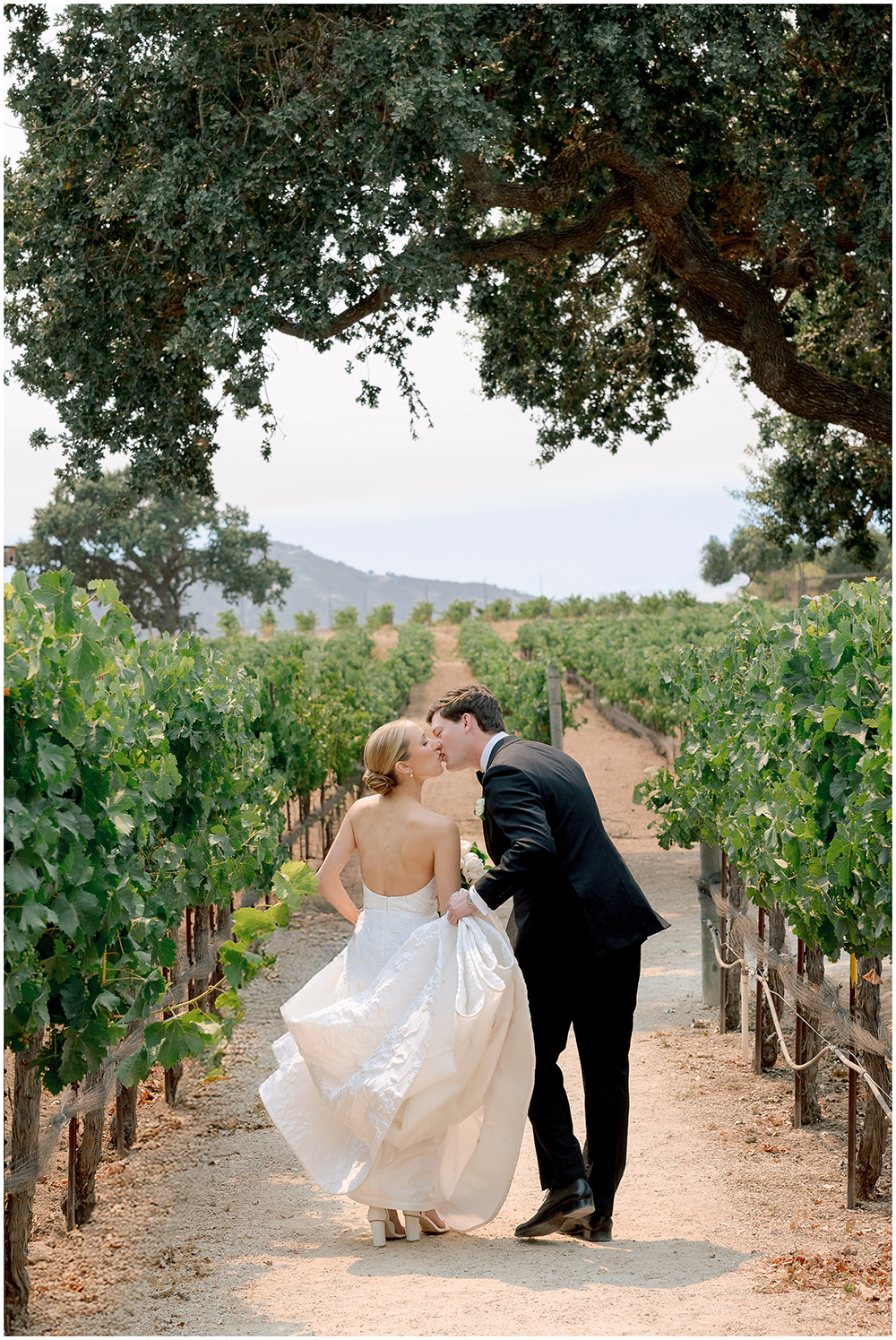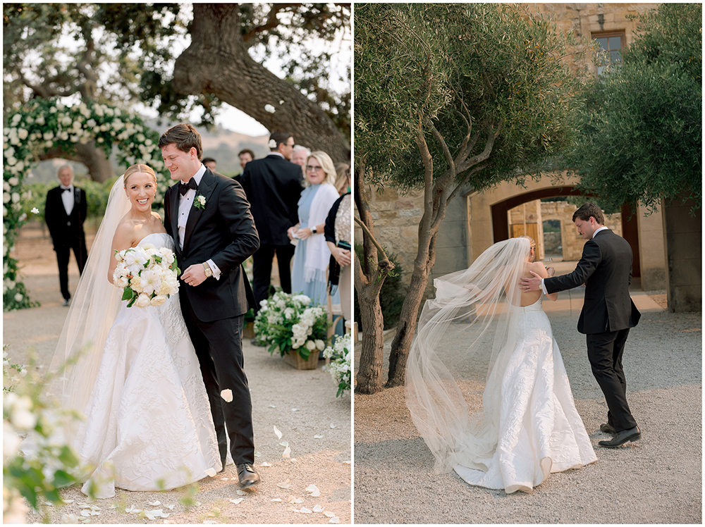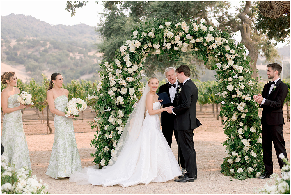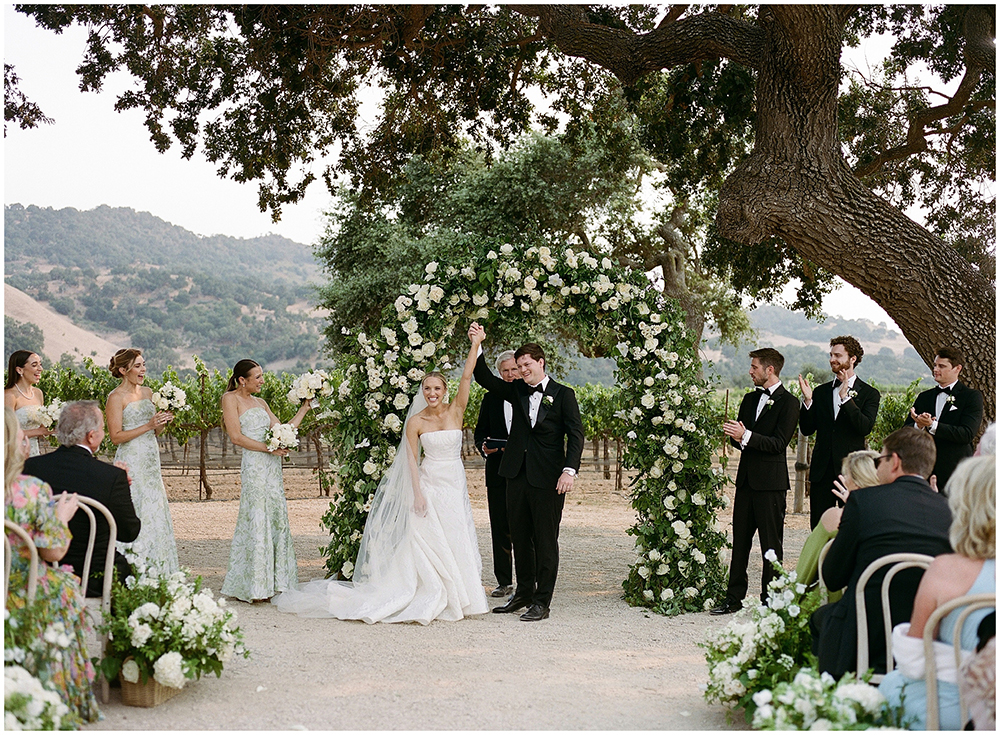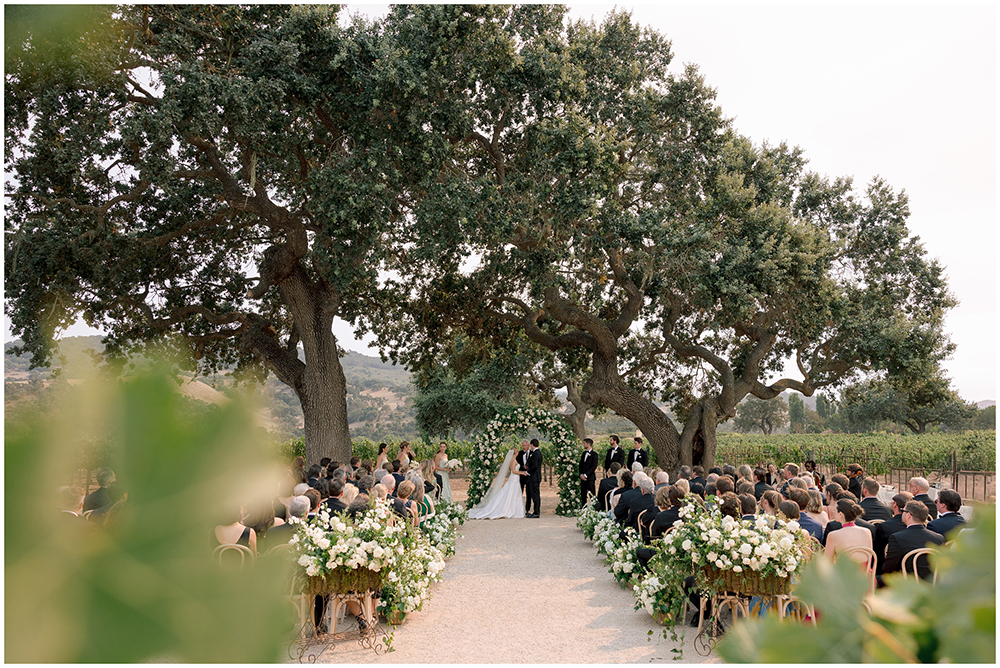 The couple exchanged vows beneath a sprawling oak tree overlooking the vineyard. The floral team at Toast Santa Barbara designed floral arrangements that complemented the natural surroundings.