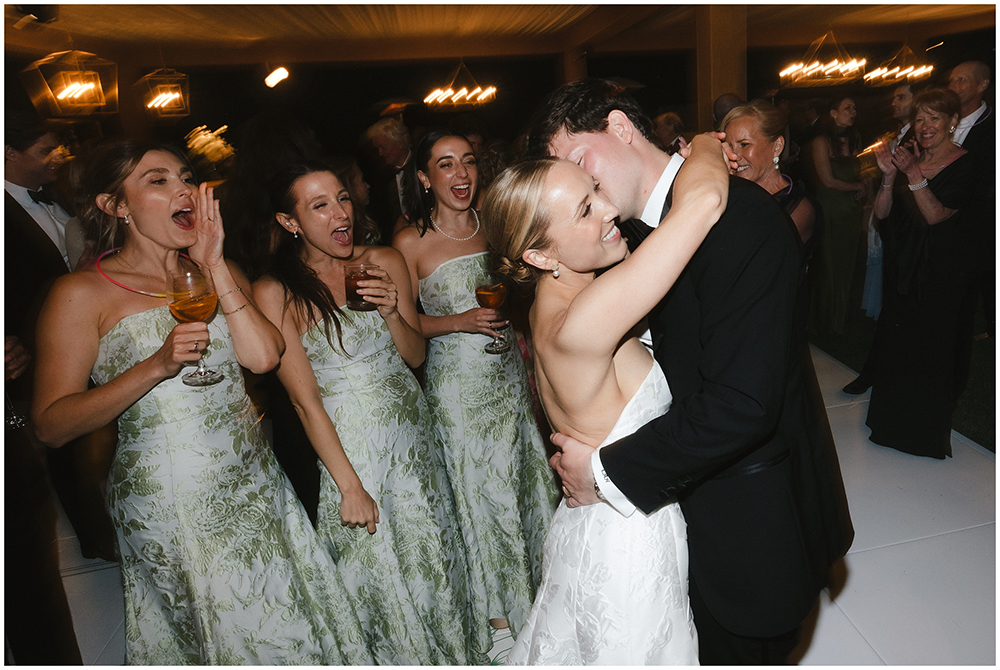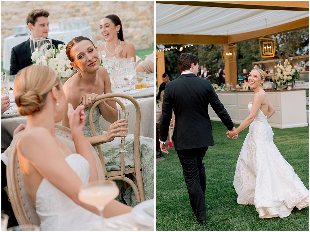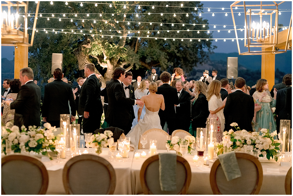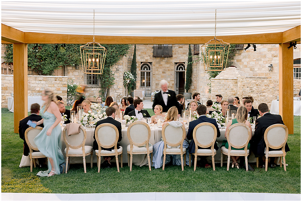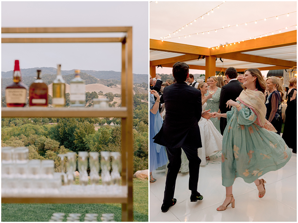 The sun dipped low and guests transitioned to an open-air structure on the lawn. Guests enjoyed sweeping views and an incredible sunset as they continued the celebration.